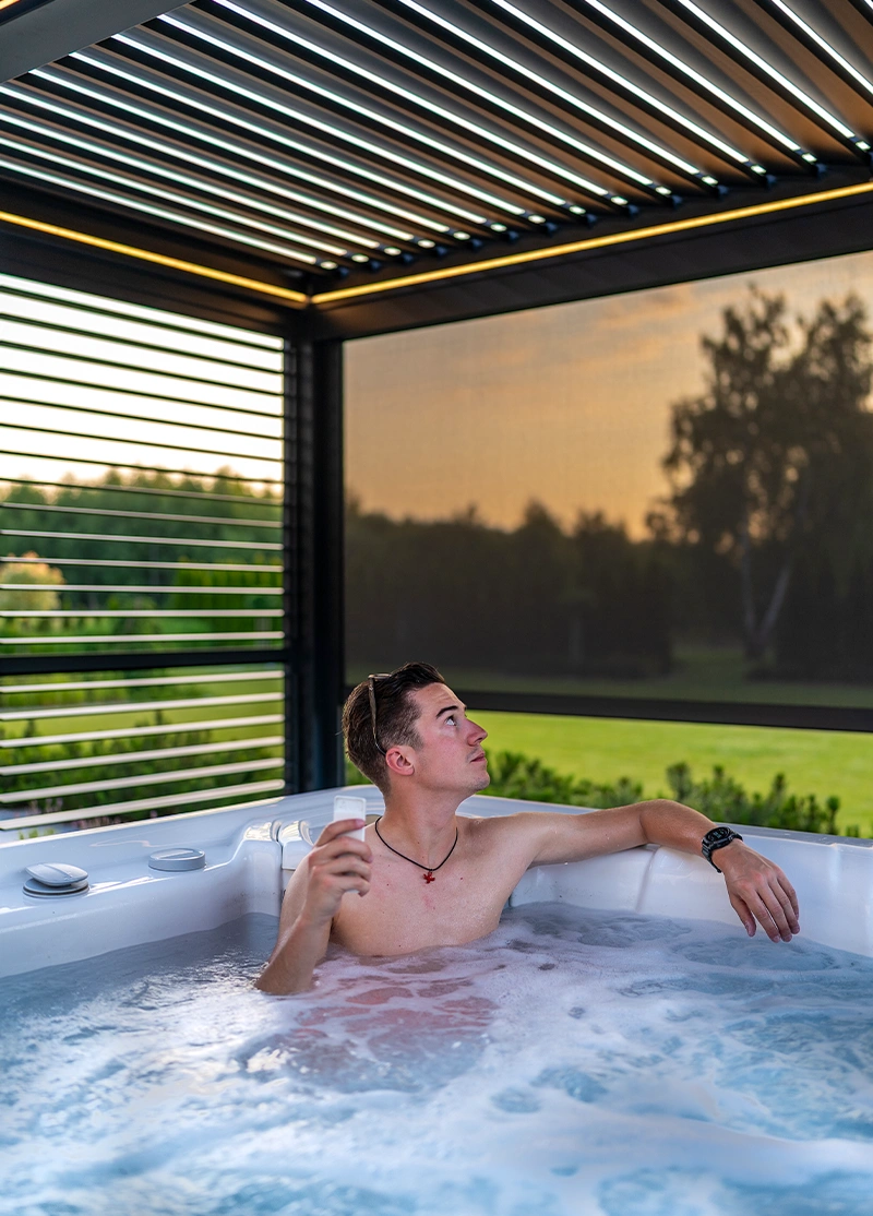 Wybierz automatyczne zadaszenie PRIME, w dwóch wymiarach - 4x4m lub 4x6m, z funkcją obejmującą zintegrowany system oświetlenia LED oraz automatykę rolet.