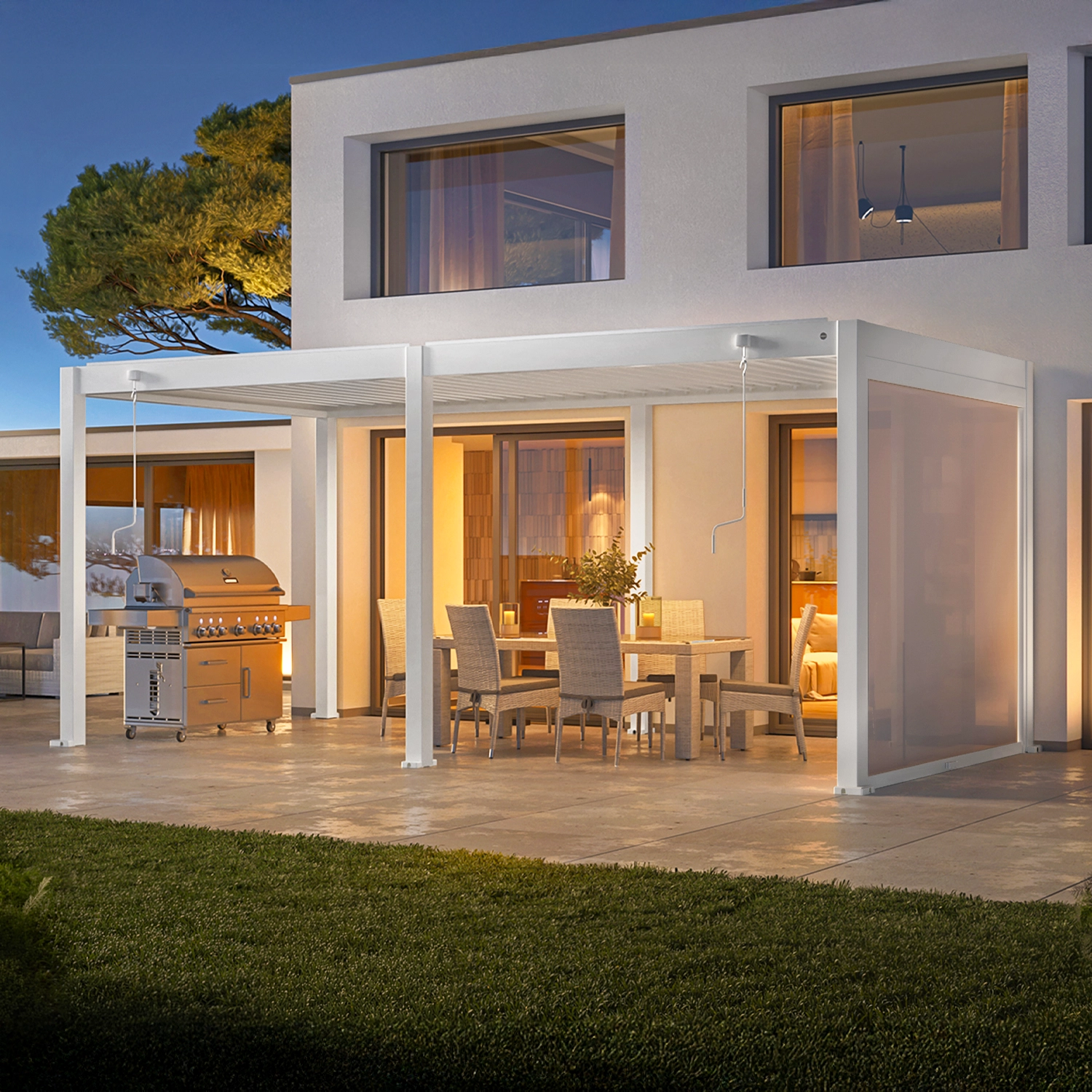 Wybierz automatyczne zadaszenie PRIME, w dwóch wymiarach - 4x4m lub 4x6m, z funkcją obejmującą zintegrowany system oświetlenia LED oraz automatykę rolet.